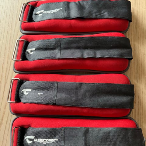 Det er fire løse lodd, de veier 70 g hver. Når jeg veier esken med alle deler i (men tatt ut posen med løse vekter) veier den i underkant av 2 kg.