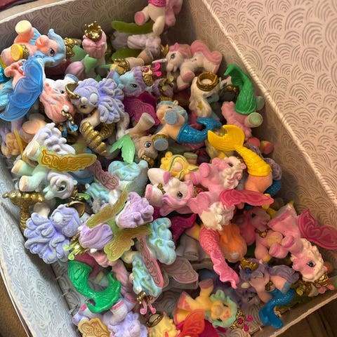 My Little Pony lekesett med flere små figurer, inkludert enhjørninger og andre fantasidyr. Settet inneholder også tilbehør som klær, vesker, sko, drikke- og matdeler, samt en liten ryggsekk og en veske. Passer for barn som liker fantasileker og samling av små figurer.