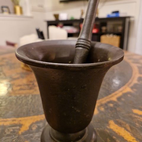 Selger en flott og solid gammel støpejernsmorter med original pistill.