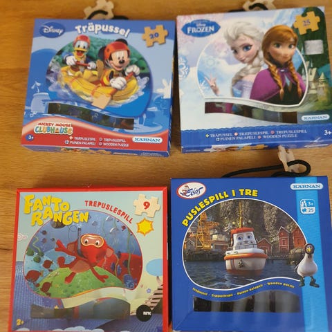 Vi selger fire kjekke puslespill med ulik vanskelighetsgrad. De er pent brukt, og alle brikkene er på plass.