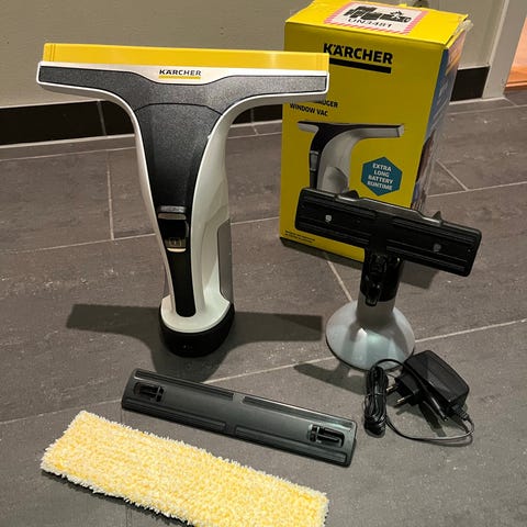 Kärcher WV2 Premium vindusvasker, batteridrevet, designet for rengjøring av vinduer og glatte overflater. Enheten er gul og svart, kompakt og ergonomisk, egnet for hjemmebruk. Selges da den ikke brukes.