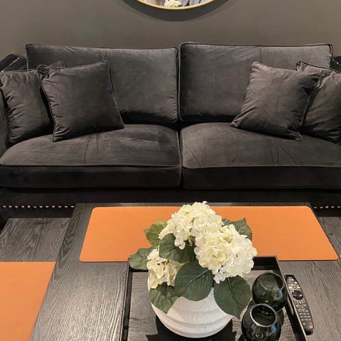 2 stk Bradford 3-seter sofa. Stoff Zenith-Mørk-Grå ,med sorte ben og antikke nagler. Fra Fagmøbler.