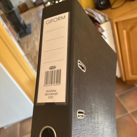 Svart ringperm i A4-størrelse med hvit ryggetikett og metallringmekanisme. Egnet for oppbevaring og organisering av dokumenter i kontor- eller hjemmemiljø.