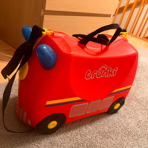oppbevaringsboks i plast, designet for barn. Boksen har en rød kropp med blå lokk og gule håndtak. Den er egnet for oppbevaring av leker eller andre barnerelaterte gjenstander.