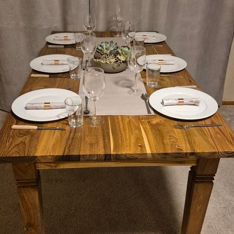 Selger et solid og vakkert spisebord i heltre gummitre (rubberwood), opprinnelig produsert i Malaysia. Bordet er nettopp restaurert og fremstår nå helt som nytt, med den naturlige trestrukturen tilbake uten farging eller beising.