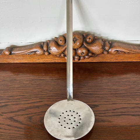Fra internett: Denne smarte sil øsen fra franske de Buyer er god og praktisk å ha på kjøkkenet. Med sil øsen kan du eksempelvis enkelt løfte mat opp av gryter med kokende vann, uten at vannet følger med. Noe som er utrolig praktisk hvis du for eksempel koker grønnsaker. Sil øsen er laget i rustfritt stål av høy kvalitet. (https://www.bakerenogkokken.no/p/de-buyer-sil-ose_42324/) (Obs: denne på internett er kun 10 cm lang).