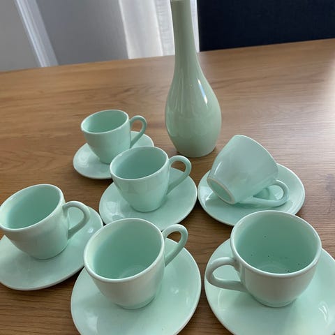 5kopper med skål pluss en liten tilhørende skål selges 1500 pluss porto. (Bitteliten skall gått av den ene koppen)