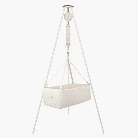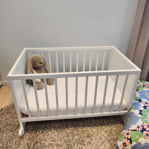 Stokke Vugge babyseng med hvit ramme og tekstilkurv i 100% bomull som kan gynges. Sengen er designet for babyer og har mål tilpasset fra nyfødt og oppover. Vi har brukt den som seng ved siden av foreldresengen, og den har fungert supert som seng for nyfødt til babyen er for stor og måtte over i sprinkelseng. Kurven beveger seg litt hver gang babyen rører på seg.