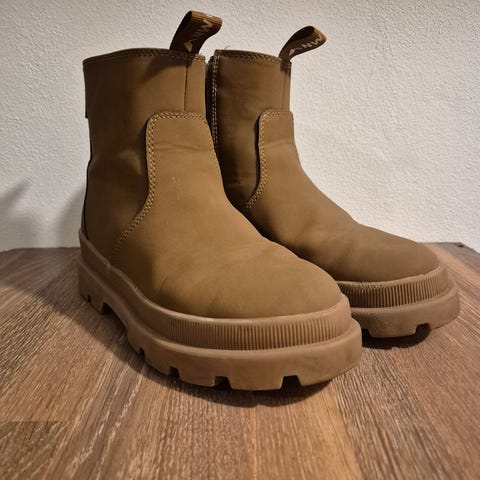 Vanntette H&M barnestøvler i unisex design, størrelse 34. Støvlene har en beige farge og er laget med glidelås på innsiden for enkel på- og avkledning. Sålen er robust og gir godt grep. Brukt kun noen få ganger.