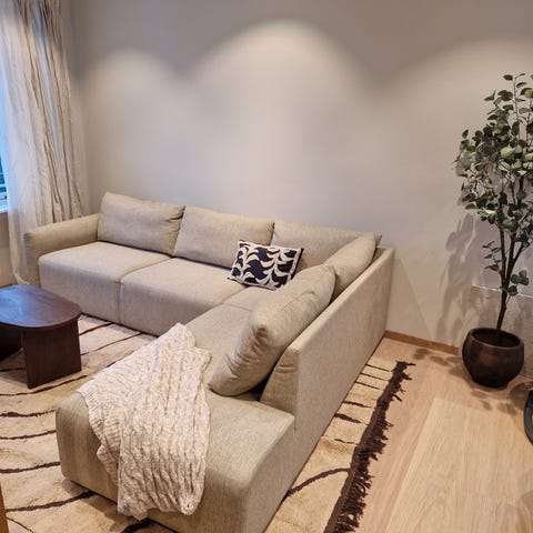 Herlig hjørnesofa selges fordi vi skal flytte til en mindre stue. Sofaen er 4 år gammel og pent brukt. Den kommer med 3 geniale nakkestøtter som kan flyttes til der man ønsker støtte