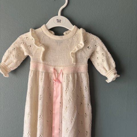 Nydelig strikket dåpskjole. Brukt en gang. Lue og sokker følger med. Passer alt fra 3 mnd og til 9 mnd.