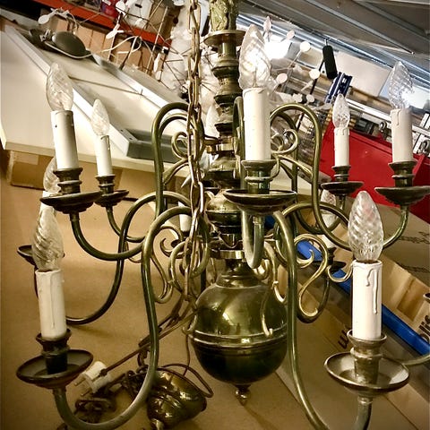 Messing lysekrone med 6 stk armer for stearinlys og elektrisk montering til 6 stk lyspærer. Det elektriske er nymontert!
