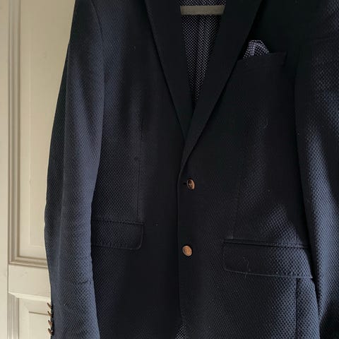 Zara Man Blazer i blå farge, herrestørrelse 52. Laget i Romania. Jakken har klassisk design med innsidefôr i lysere tone.