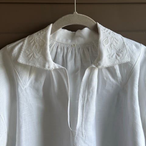 Selger en pent brukt bunad skjorte. Skjorta er blitt brukt til Ringeriksbunad. Har et lite rift øverst ved kragen, men dette kan fint sys igjen.