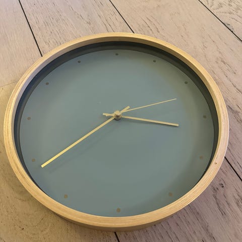 Veggklokke med urskive i grå betong, visere i messing og oppheng i kunstskinn.