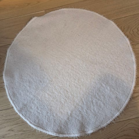 Rundt teppe med en diameter på 130 cm i lys rosa farge. Laget av mykt, teksturert materiale som gir en behagelig overflate. Egnet for bruk i stue, soverom eller andre oppholdsrom.