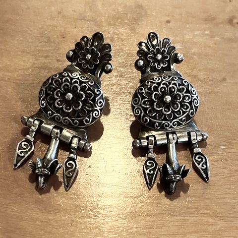 Vintage / antik øredobber, sølvfiligran med skru fra sølvsmed Henrik Lund. Stæmpel Henrik Lund 830 S. Super fint stand går sikkert att pusse opp litt mer om man vill det. Lengde 4.5 cm bredd 2.5 cm