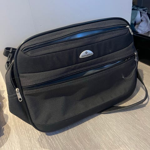 Samsonite veske i stoffmateriale, kan brukes som håndbagasje og enkelt settes på en koffert. Vesken har et enkelt og funksjonelt design med sort farge, egnet for daglig bruk eller reise. Den har håndtak og avtakbar skulderrem for fleksibel bæring.