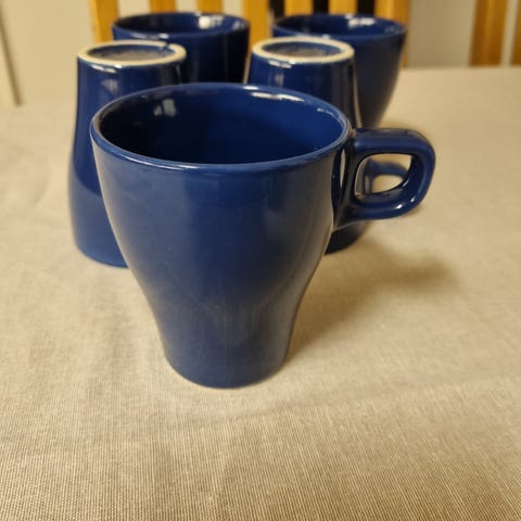 3 blå kaffekopper. 2 er i perfekt stand, 1 har et lite merke på undersiden.