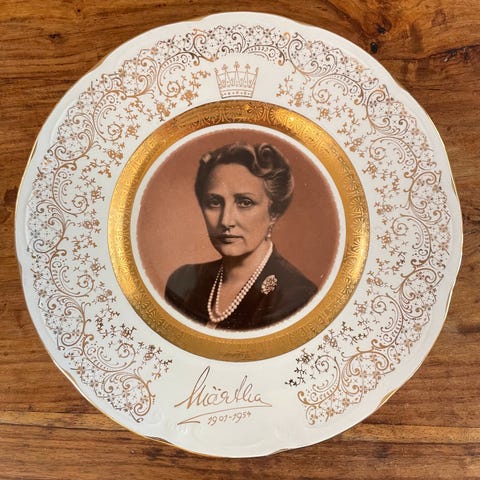 Selger en eldre minnetallerken fra Figgjo, laget til minne om Märtha (1901–1954). Fatet har dekor i gull og klassisk Figgjo-design, med stor portrettmidt og signaturen “Märtha 1901–1954” på kanten.