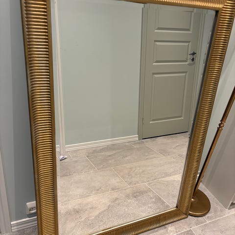 Speil med grønn treramme. Kan enkelt males. Noen bitte små skrammer på speilet.