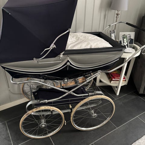 Med tungt hjerte selger vi dette kunstverket av en barnevogn. Klassiske Silver Cross Balmoral håndlaget i England, brukt av de kongelige gjennom årene! Stunning design, håndlagde detaljer, vakker, samt den er også praktisk på sin måte. Praktisk i den forstand av at vognen har god plass til både baby og vognpose, ingenting ligger trangt som i mange andre vogner.