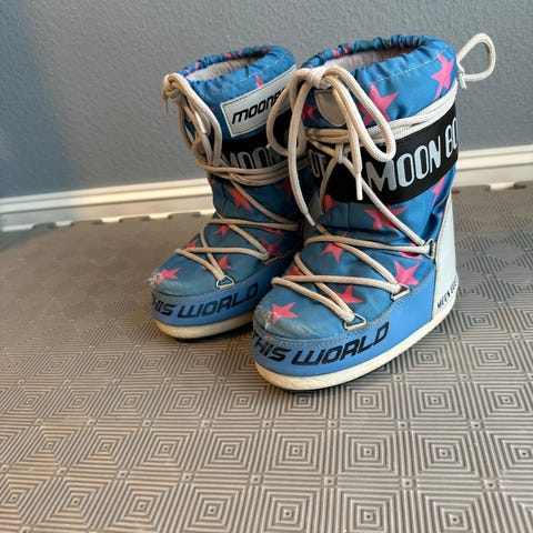 Moon Boots 27/30 de blå er limt i tuppen foran på venstre side for å gjøre dem tett. Ellers så fremstår de som meget pene. De rosa har noe bruks merker på tuppene.