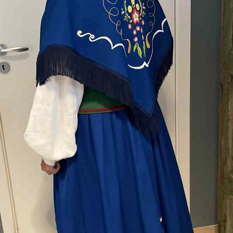 Selger pent brukt karmøybunad i fargen skarp blå.