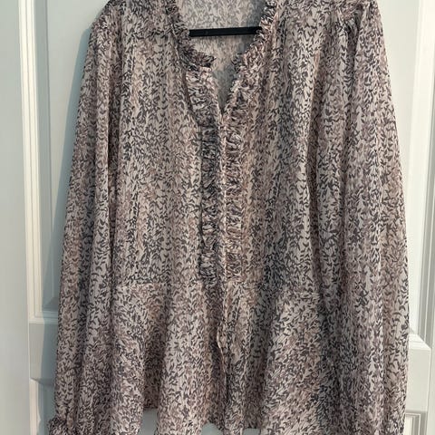 Flott bluse/ skjorte med hullmønster, meget pent brukt. Benyttet ved 2 anledninger. Den har 3/4 lange ermer. Meget stilig alene eller under cardigan eller genser- gjerne med v hals:)