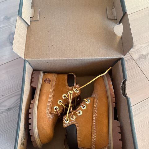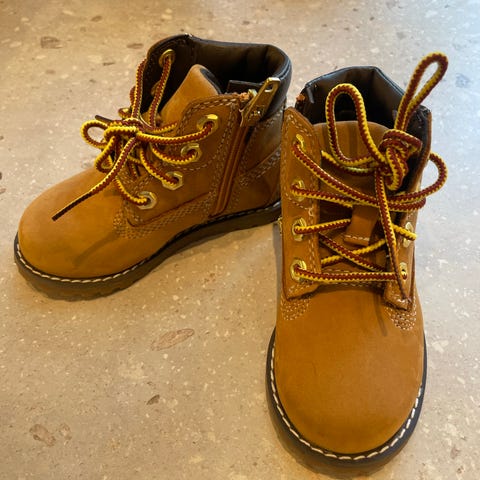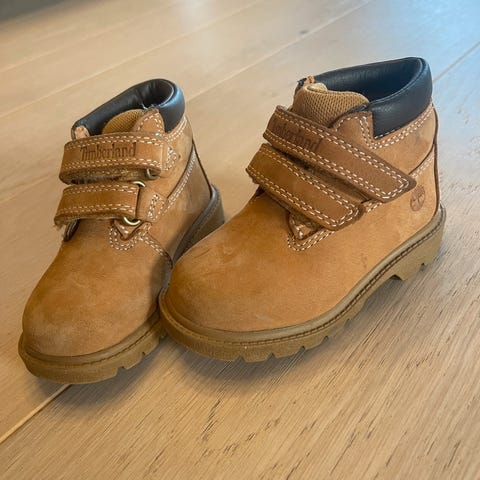 Timberland barnesko i størrelse 22, designet for gutter. Skoene har en kombinasjon av brun semsket skinn og blå detaljer. De har borrelåsfeste og elastiske snøringer for enkel på- og avkledning. Sålene er robuste og egnet for utendørs bruk.