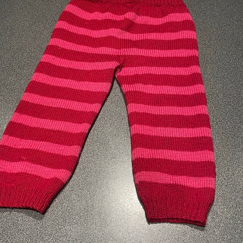 Hjemmestrikket kjole med tilhørende bukse med strikk i livet. Brukt 2 ganger i forbindelse med et selskap og juleverksted. Buksen har fått en flekk med blå maling bak på setedelen av buksen (se bilde). Brukt når datteren min var 1år og brukte str 86. Lagt ved bilde med målinger av plaggene.