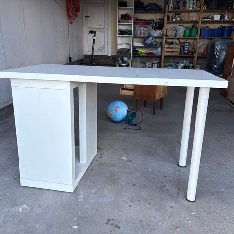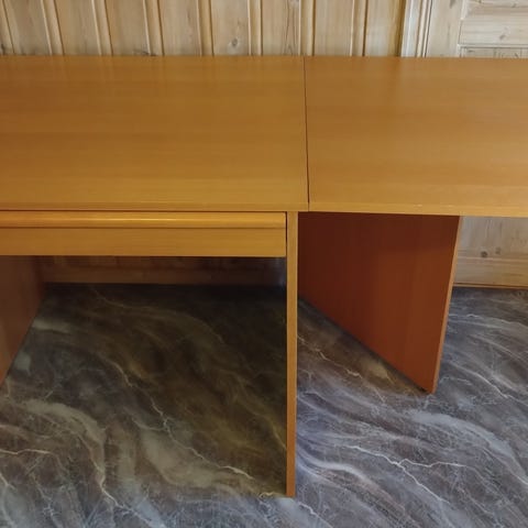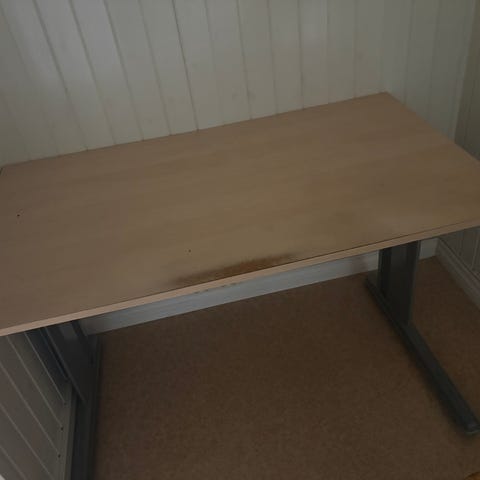 Skrivebord med buet bordplate og lukket front gis bort. Bordet har et enkelt og elegant design. Er egnet for bruk som arbeids- eller skrivebord. Designet gir god plass til ben og utstyr under bordplaten. Skrive-/arbeidsbordet har målene: 180 cm bredde, 87 cm dybde på midten (på ytterkant av buen 75 cm) og 74 cm høyde. Må hentes i Sandefjord.