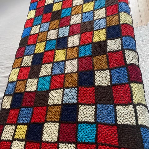 Pledd har fargerikt rutemønster i flere farger som rød, oransje, blå, lilla, gul og grønn.