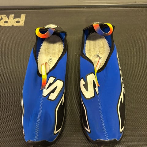 Salomon Walking Coverboot fottøy i størrelse L 42 2/3 til 44 2/3Fargen er hovedsakelig blå med svarte og hvite detaljer, samt små innslag av rødt og gult. Materialet ser ut til å være vannavstøtende med en slitesterk gummisåle med godt grep. Designet er unisex og egnet for utendørs bruk. Coverbootene er testet en gang før å se om de passer. Kommer med boks.