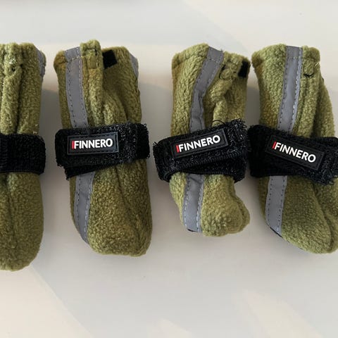 Sele svært lite brukt da vår valp vokste mye den første uken. Tilhørende bånd aldri vært i bruk. Oransje potesokker kun vært prøvd på, var dessverre for små. Blå potesokker (best i test) kun prøvd en gang men ble for små til forlabbene.