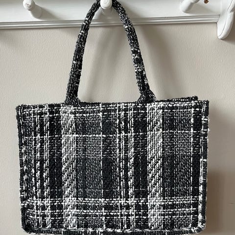 Stilig liten veske fra H&M, brukt kun én gang – fremstår som helt ny. Klassisk sort- og hvit rutemønster (houndstooth), med både håndtak og justerbar skulderrem i tekstil. Perfekt størrelse til mobil, nøkler og småting.