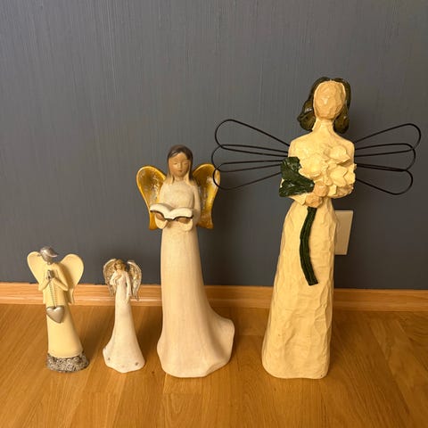 To nydelige vintage keramikk engler, lysestaker i blått og gull