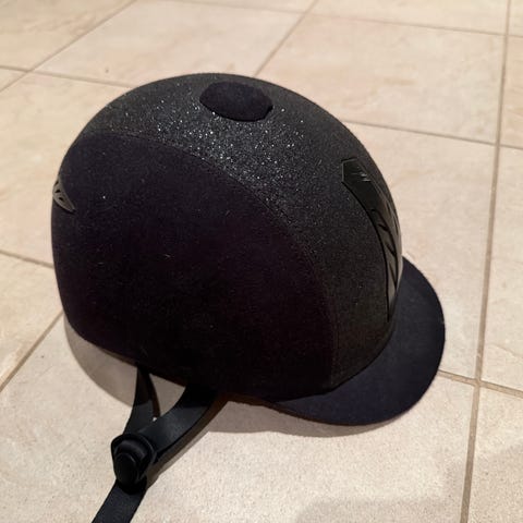 Nydelig glitrende ridehjelm fra Horze i størrelse 53-54 selges. Svært lite brukt, og aldri vært utsatt for fall etc.