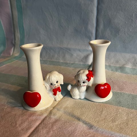 I god stand, ser ingen skader. Har 2 hull hver i de utover hengende greinene, for husker muligens? Er supersøte, hundevalp på den ene, og harepus på den andre, pluss fete små fugler på gren. Merket import under. Selges samlet for 390 kr. Kan sende, ikke fiks ferdig eller helt hjem