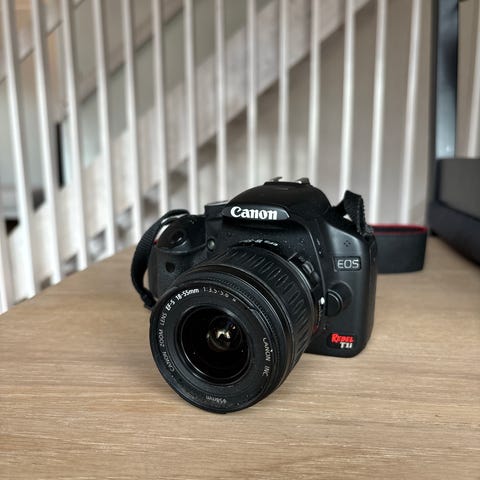 Et eldre Canon EOS 500D Digitalkamera. Kameraet har en skjerm på baksiden for visning av bilder og innstillinger. Det har standard tilkoblinger for AV- og digital utgang. Kameraet er svart og har et ergonomisk grep for enkel håndtering. Selges med tamaron objektiv og kamera veske