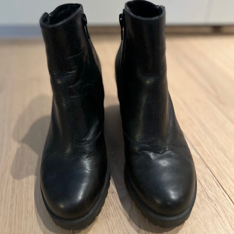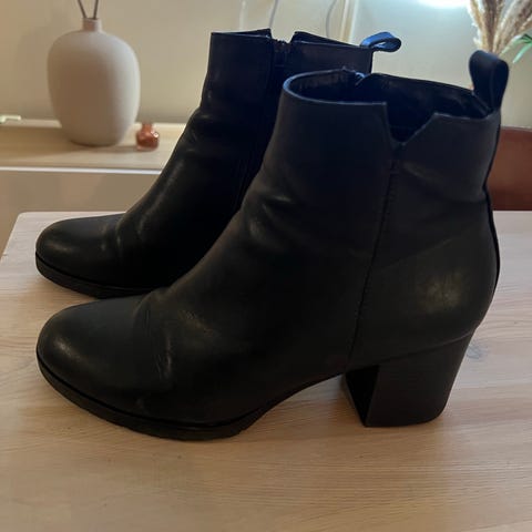 ECCO støvler i svart skinn, størrelse 38 for dame. Støvlene har en hæl og glidelås på siden for enkel på- og avkledning. Egnet til hverdagsbruk og pent. Litt slitt på Helen, ellers pene i skinnet