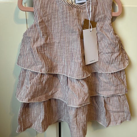 Fint vevd stoff, gulltråder, veloursløyfe på brystet. Søt fasong.