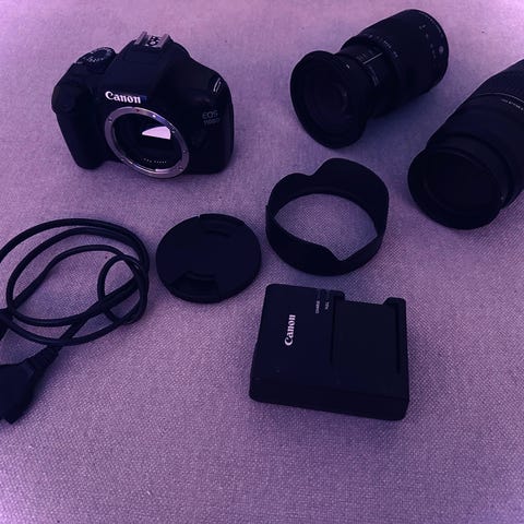 Selger et Canon EOS 1000D med diverse objektiver og tilbehør.