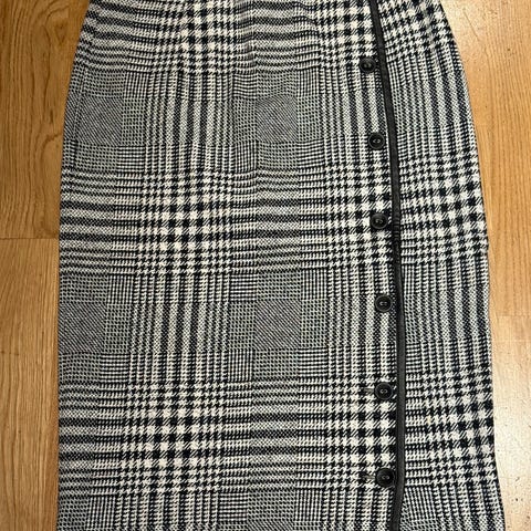 Skjørtet har stretch med glidelås bak. Livvidde : 37 cm Skjørtet er 45 cm bredt på midten og 45 cm bredt nederst. Lengde skjørt er 52 cm. S