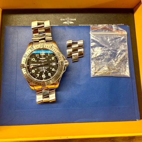 Eske og papirer: Ja. Inkluderer original inner- og yttereske, hefter, COSC-sertifikat, garantihefte og Breitling-fabrikks