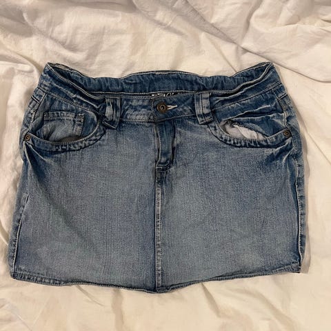 Ubrukt jeans miniskjørt med slitte detaljer, splitt detalj bak