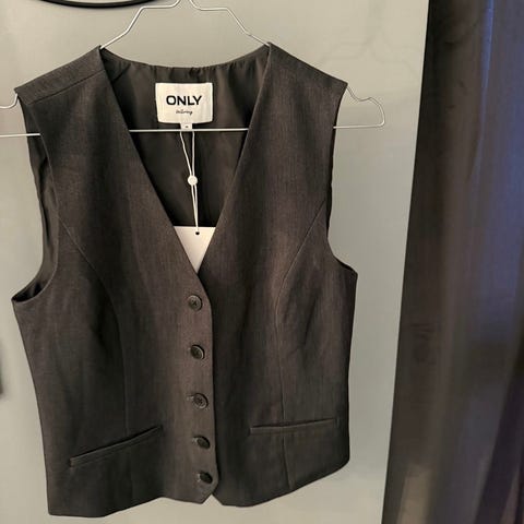 ONLY rutete vest for kvinner i størrelse S. Vesten har et flerfarget rutemønster og er uten ermer. Den har to knapper foran og lommer på sidene.