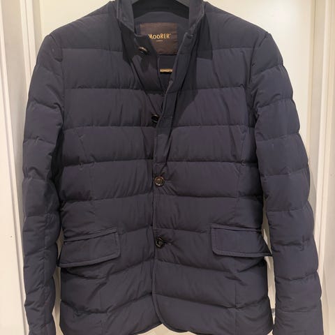 Selger en elegant og lett Massimo Dutti dunjakke i blå farge. Jakken er lite brukt og fremstår i svært god stand uten merker, hull eller slitasje.