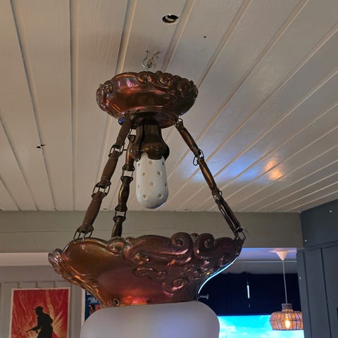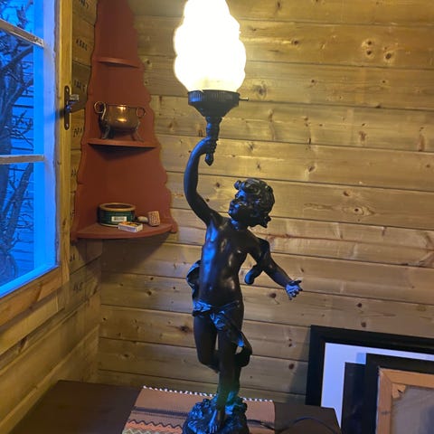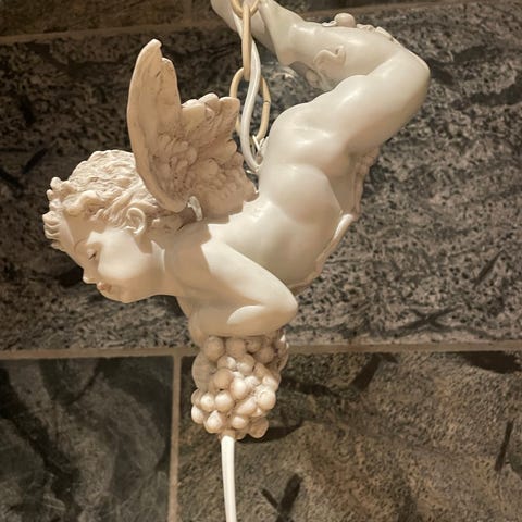 Hengende lampe med dekorativ engelfigur og glasskjerm. Lampen er utformet med detaljer og har en skjerm i frostet glass med bølgete kanter. Passer for takmontering og gir et dekorativt lys i rommet.