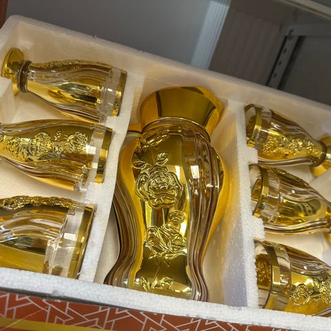 Vintage sett med en vase, karaffel og 6 shotglass med gulldetaljer.
